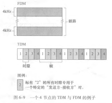时分多路复用(TDM)和频分多路复用(FDM)时两种能够用于在所有共享信道节点之间划分广播信道宽带的技术。假设一个支持N 个节点的信道且信道的传输速率为R bps。TDM将时间划分为时间帧(time frame),并进一步划分每个时间帧为N个 时隙(slot) 。然后把每个 时隙分配给N个节点中的一个。无论何时某个节点在有分组要发送的时候,它在循环的TDM帧中指派给它的时隙内传 输分组比特。通常,选择的时隙长度应 使一个时隙内能够传输单个分组。