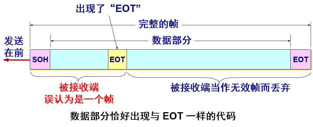 如果数据中的某个字节的二进制代码恰好和 SOH 或 EOT 一样,数据链路层就会错误地“找到帧的边界”。