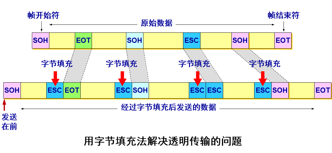 - 发送端的数据链路层在数据中出现控制字符“SOH”或“EOT”的前面插入一个转义字符“ESC” (其十六进制编码是 1B)。