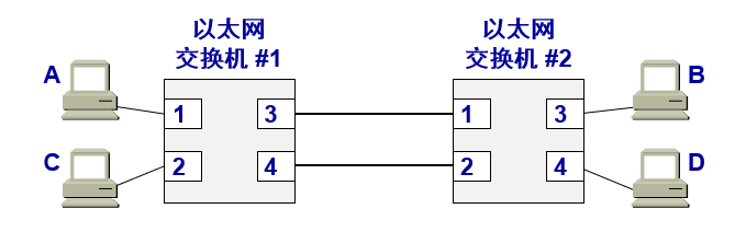 如图,假定开始时,交换机 #1 和 #2 的交换表都是空的,主机 A 通过接口交换机 #1 向主机 B 发送一帧。