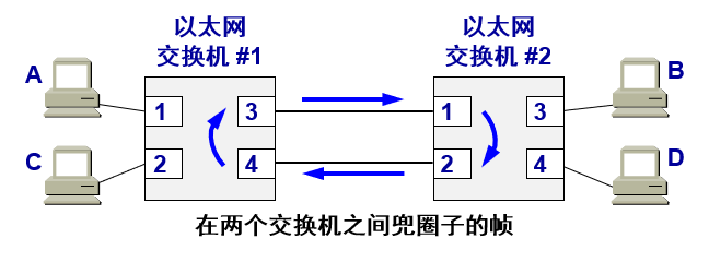 按交换机自学习和转发方法,该帧的某个走向如下:离开交换机 #1 的接口 3 → 交换机 #2 的接口 1 → 接口 2 → 交换机 #1 的接口 4 → 接口 3 → 交换机 #2 的接口 1 →……。这样就无限制地循环兜圈子下去,白白消耗了网络资源。