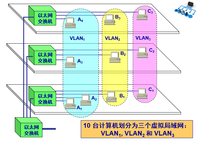 虚拟局域网 VLAN 是由一些局域网网段构成的与物理位置无关的逻辑组,而这些网段具有某些共同的需求。每一个 VLAN 的帧都有一个明确的标识符,指明发送这个帧的计算机是属于哪一个 VLAN。