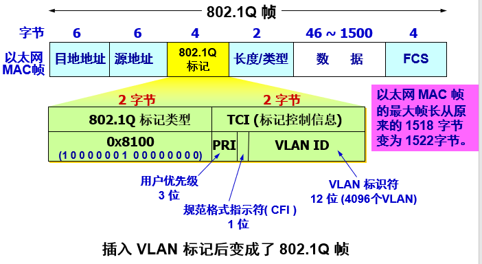 插入 VLAN 标记得出的帧称为 802.1Q 帧 或 带标记的以太网帧。