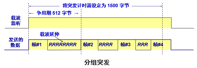 当很多短帧要发送时,第一个短帧要采用载波延伸方法进行填充,随后的一些短帧则可一个接一个地发送,只需留有必要的帧间最小间隔即可。这样就形成可一串分组的突发,直到达到 1500 字节或稍多一些为止。