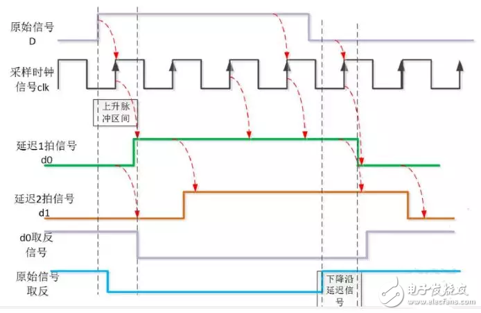 原始信号与延迟一拍的信号 d0 的反向信号相与,就是上升沿脉冲;