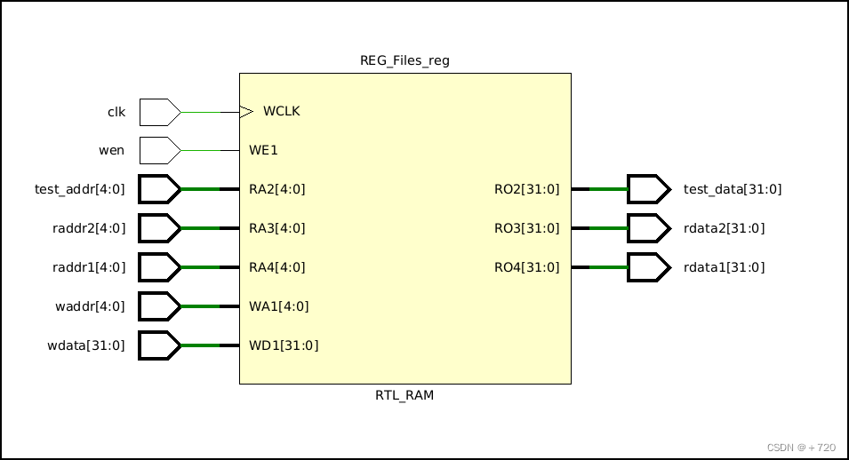 该模块有一个用于存储数据的寄存器数组REG_Files。initial块用于将所有寄存器初始化为0。具有正边沿触发的clk输入的always块用于在wen为高电平时执行写操作。