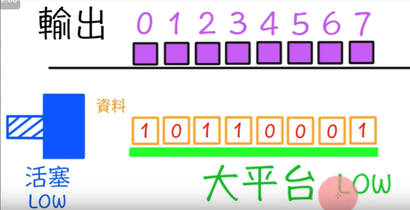 到大平台(ST)上。最后把大平台上抬,8位数据就同时输出去了。(ST输出高电平)。