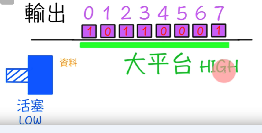 解释:每次先把大平台放下(ST输出低电平),把活塞拉回,等待数据放上(SH输出低电平)