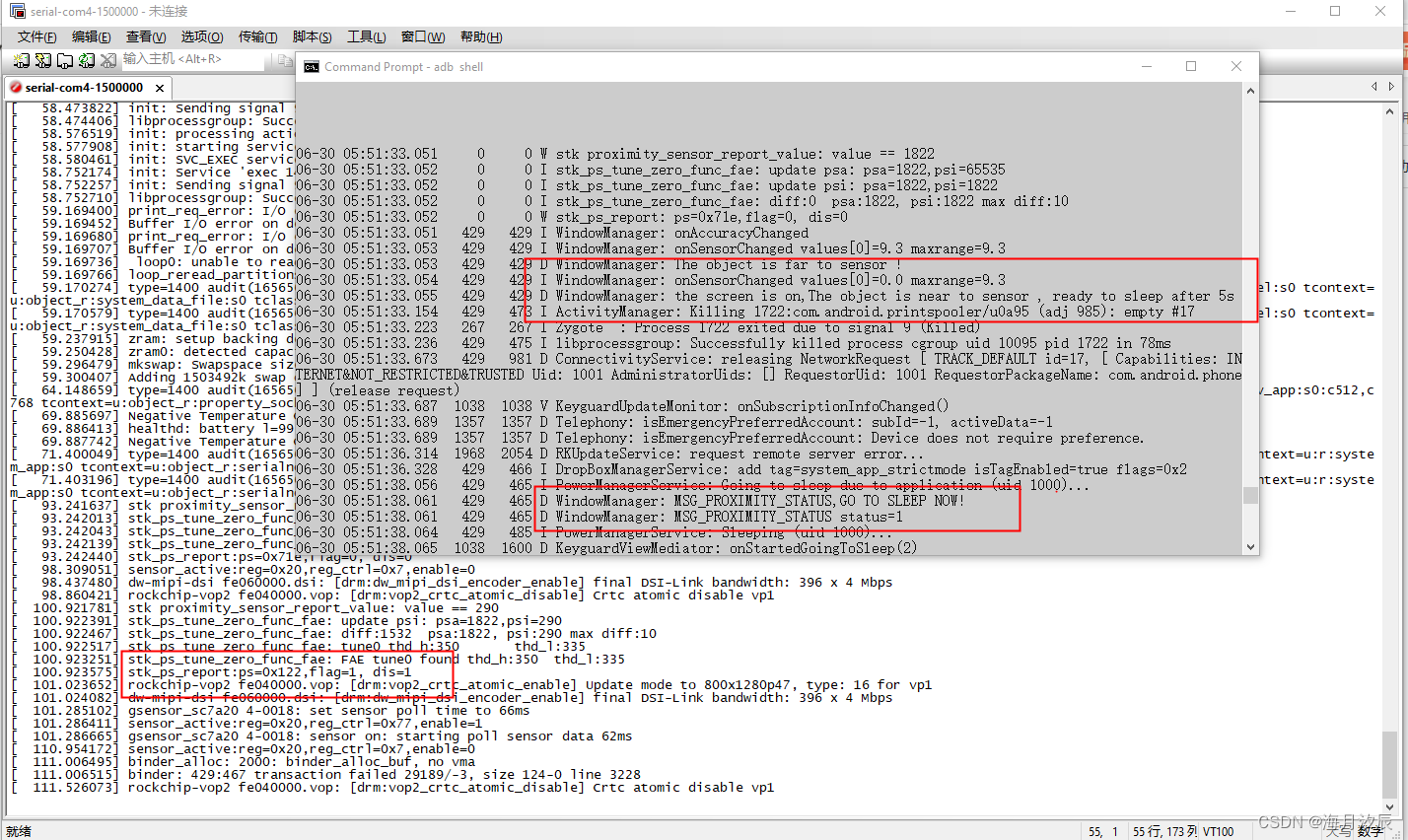 3、运行log,当有物体遮挡传感器5s后会进入灭屏休眠,移开之后会唤醒亮屏幕。