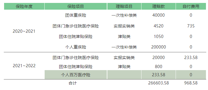 这位员工就非常好的基于公司的商业保险,在有限的预算内,自费(且通过医保卡余额支付)购买了个人重疾险与个人医疗险。她在公司4万元的重疾保险上,增加了一份20万的个人重疾险(通过医保账户支付保费,一年大约几百元保费),还增加了一份个人的百万医疗(也是医保账户支付)。搭配上公司给的保险,她总体的医疗费用只有900多元自费,还获得了26万的重疾理赔款,不仅可以用于支付医疗费用,也可以弥补自身的其他经济损失。