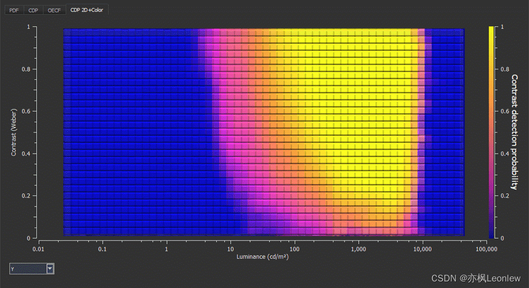 DTS集成了用于评估CDP的专用分析软件。软件根据从被测设备收集到的数据点创建出热图(heat map)。这些热图所展示的每个数据点根据系统在一个宽的亮度和对比度范围中的表现绘制。黄色表示系统性能表现很高,蓝色表示较低的性能表现。有一个重要的地方需要注意,每种被测系统的需求不同,因此即便是热图看起来性能表现较低,但实际上对于特定的被测相机仍然是可接受的。