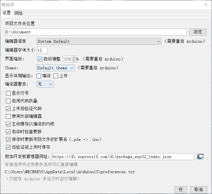 首先在Arduino IDE中配置好ESP32的开发包