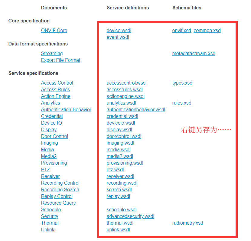 在Onvif官网Specification页面中下载提供的功能相应的wsdl文件,如analytics.wsdl;devicemgmt.wsdl等。直接将WSDL的链接另存为,保存下来就是wsdl文件了。因为不太确定哪些文件不需要,所以我这里全部都下载了,全部放在bin下新建的wsdl文件夹内,包括这些wsdl中需要调用的xsd文件,