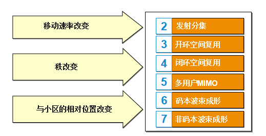 | 多用户MIMO | 2/4 | 低 | 低速移动 | 高 | 小区中心 |