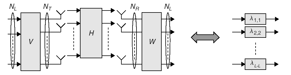 - 特征波束成形:对信道矩阵进行特征值分解,信道将转化为多个并行的信道,在每个信道上独立传输数据。