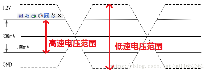 (1) HS 高速传输模式,用于传输突发数据,同步传输,信号为差分信号,电平范围为100mv-300mv,传输速度范围是80-1000Mbps。在该模式下传输时,当差分线正端收到 1.2V 信号,负端收到 0V信号时,这时接收端识别为 1。反之为0。