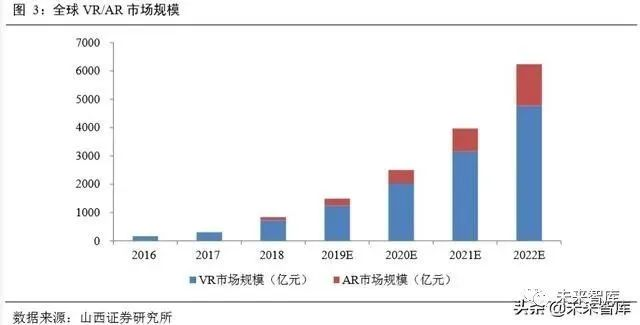 根据《超高清视频产业发展行动计划(2019-2022 年)》的目标规划,到 2022 年,超高清视频产业总规模将超过 4 万亿元,超高清视频用户将达到 2 亿人。2018 年全球 VR/AR 市场规模超过 700 亿元,同比增长126%,预计 2020 将超过 2000 亿元,VR 占据主体地位,AR 增速显著。