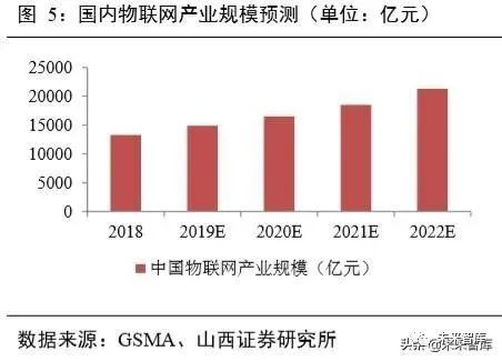 据 GSMA 统计数据显示,2018 年全球物联网连接数达 91 亿,2020 年预计 126 亿,2025 年全球物联网设备(包括蜂窝及非蜂窝)连接数将达到 252 亿。我国物联网行业的十三五规划目标是到 2020 年国内物联网行业规模达到 1.5 万亿元,据 GSMA 测算,十三五规划目标有望超预期完成,并且到 2022 年,中国物联网产业规模将超过 2 万亿元,达到 21300 亿元。