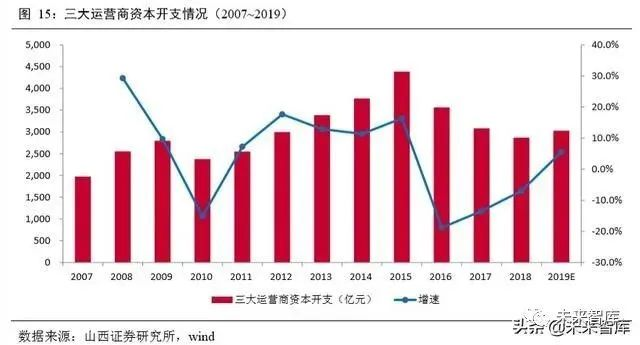 4G 时代,运营商传统业务(语音短信)持续下滑,数据业务(移动互联网流量、视频流量)快速增长,成为电信业务增长的核心驱动力,运营商进入流量经营时代。但是自 2017 年以来,随着不限量套餐推出以及流量漫游费取消,份额考核压力下的低价过度竞争使运营商行业增长陷入停滞。5G 时代,物联网将带来连接规模增量,大量垂直领域的行业应用将助力运营商打开 2B 的广阔蓝海市场,企业客户和个人客户的高等级、定制化需求市场有望开启,有助于重构运营商商业模式,实现运营商的再成长。在经历了几年 4G 建设投入高峰后,自 2016 年开始,运营商的资本开支经历了连续三年的下滑,随着 2019 年 5G 周期的开启,运营商的资本开支将触底回升,并有望稳步回升,迎来比 4G 峰值更高跨度更长的上行周期。