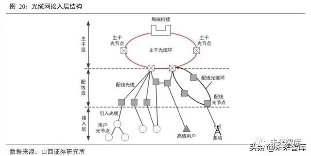 我国运营商经过多年的网络建设和优化,已经建成了较为稳定的城域光缆网。城域光缆网架构分为核心层、汇聚层和接入层,其中接入层由主干光缆、配线光缆和引入光缆构成。主干光缆主要采用环形结构;配线光缆包括树形、星型、环形三种结构;引入光缆以星型和树型结构为主,光缆网接入层结构如图 19 所示。