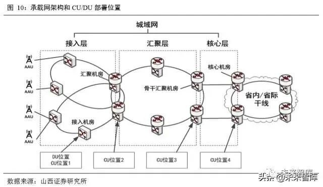 BBU 拆分为 CU 和 DU,使得无线接入网网元从 4G 时代的 BBU+RRU 两级结构演进到 CU+DU+AAU三级结构,相应的无线接入网架构也从包含前传(BBU 和 RRU 之间的网络)和回传(BBU 和核心网之间的网络)的两级架构变为 5G 时代包含前传(DU 和 RRU/AAU 之间的网络)、中传(CU 和 DU 之间的网络)和回传(CU 和核心网之间的网络)的 3 级架构,DU 以星型方式连接多个 AAU,CU 以星型方式连接多个DU。
