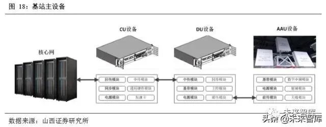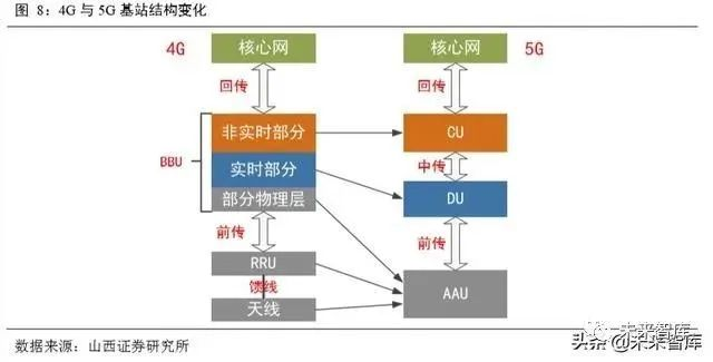 无线接入网侧,基站作为提供无线覆盖,连接无线终端和核心网的关键设备,是 5G 网络的核心设备,相比于主要由 BBU 基带处理单元、RRU 射频拉远单元、馈线和天线构成的 4G 基站,5G 基站 BBU 功能被重构为 CU 和 DU 两个功能实体, RRU 与天线合并为 AAU 实体。