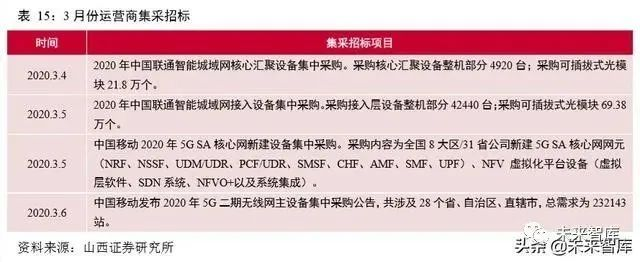 运营商积极响应国家号召。中国联通于 2 月 21 日表示,前三季度与电信合作力争完成 25 万站基站建设,较原定计划提前一个季度完成全年建设目标,中国移动 2 月 29 日表示,全年“建设 30 万个 5G 基站”的目标不会变,在全国地级以上城市建设 5G 网络。进入 3 月以来,运营商 5G 招标工作逐步启动,随着全国疫情持续缓和,各地陆续复工复产,5G 建设加速。