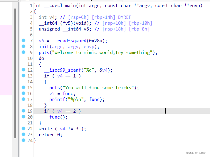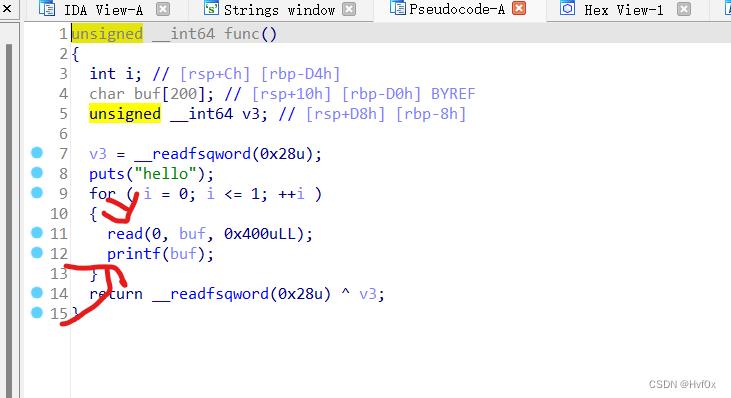 Main函数的逻辑比较简单,分析然后进入func函数,发现两漏洞利用点: