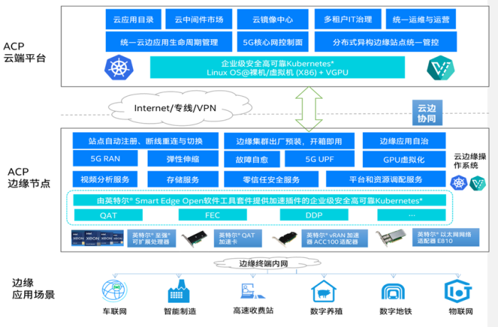 通过与智能边缘开放环境Intel Smart Edge的强强联合,在低成本、快速容器化的同时,有效拓展容器端口控制能力(QAT),统一应用运维,边缘侧节点可应对断网场景,业务不中断,帮助工业互联网企业在多样化的环境下轻松实现更高可用、更高性能的5G专网功能,构建统一的边缘应用开发、部署、托管环境,形成低时延、高可靠、高带宽的网络基础设施,支撑工业互联网系统高效、稳定运行。