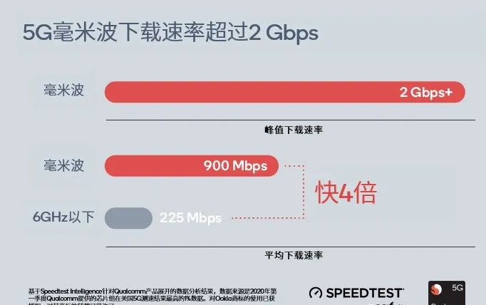 根据Ookla SPEEDTEST的 实 际 测 试 结 果 ,在5G毫米波频段现有网络的平均下载速率是Sub-6 GHz频段(6 GHz及以下频段)的4倍。由此可以看到5G毫米波的巨大吸引力。
