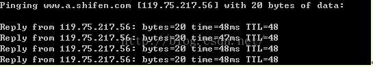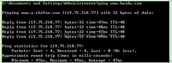 此命令用来测试所发出的4 个32 字节的数据包(默认值为4)被IP 地址为119.75.218.77 的目的主机接受并返回的时间和接受情况等,从运行结果可以看出,四个数据包成功接受并返回,所用时间是分别为:47ms、48ms、47ms和49ms.