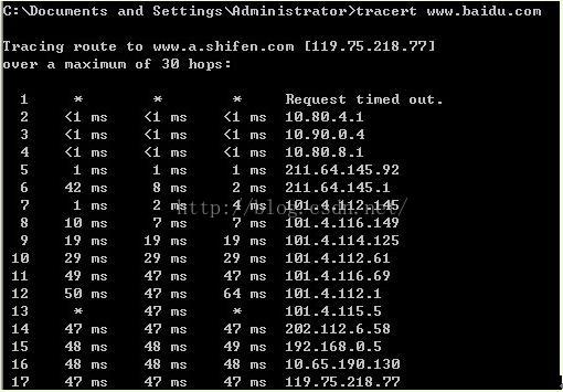 由运行结果可以看出,数据包必须通过17个路由器(Request timed out,