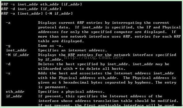 -s InetAddr EtherAddr [IfaceAddr] :向 ARP 缓存添加可将 IP 地址 InetAddr 解析成物理地址 EtherAddr 的静态项。要向指定接口的表添加静态 ARP 缓存项,请使用 IfaceAddr 参数,此处的 IfaceAddr 代表指派给该接口的 IP 地址。