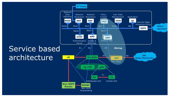 3GPP的5G初始架构为eMBB,即5G阶段1。与前几代不同的是,在控制平面中,只有基于服务的接口(SBI)是基于TLS、REST、HTTP、JSON等。网络暴露功能(NEF)提供与外部合作伙伴的连接,安全边缘保护代理(SEPP)用于与其他运营商的安全连接,网络切片选择功能(NSSF)负责切片选择,网络存储库功能(NRF)用于发现不同功能之间的通信并授权其通信。顾名思义,用户数据管理(UDM)和认证服务器功能(AUSF)分别用于用户数据管理和身份验证。射频部分分为中央单元(CU)和分布式单元(DU),其中CU可以连接多个DU并驻留在云上。应该注意的是,对于用户平面和控制平面,可以有单独的CU。
