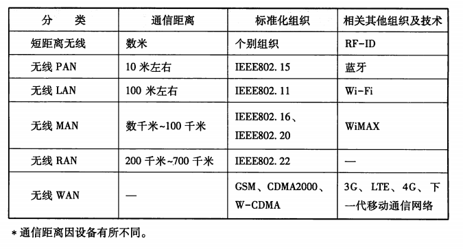 无线通信,依据通信距离可分类型。IEEE802委员会制 定了无线PAN (802. 15)、无线LAN(802. 11)、无线MAN(802. 16)以及 无线RAN(802. 22)等无线标准。无线WAN的最典型代表就是手机通信,手 机通过基站能够实现长距离通信。
