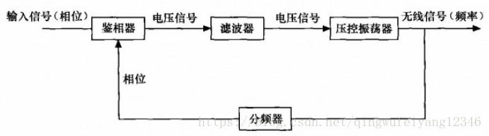 锁相环就是锁定相位的环路,其有鉴相器、滤波器和压控振荡器3部分组成前向通路,由分频器组成频率相位的反馈通路。锁相环的工作原理是检测输入信号和输出信号的相位差,并将检测出的相位差信号通过鉴相器转换成电压信号输出,经低通滤波器滤波后形成压控振荡器的控制电压,对振荡器输出信号的频率实施控制,再通过反馈通路把振荡器输出信号的频率、相位反馈到鉴相器。锁相环再工作过程中,当输出信号的频率成比例的反映输入信号的频率时,输出电压和输入电压保持固定的相位差,这样输出电压与输入电压的相位就被锁住了。