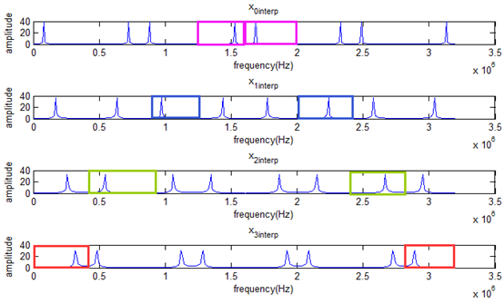 T1/T2 = 4,故上采样倍数为4,上采样有原数据保持、插值、补零等方法,这里采用最基本的补零方法。不失一般性,X0(n)、X1(n)、X2(n)、X3(n)分别按不同频率的正弦信号处理。