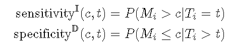 累积病例/动态ROC定义了在时间t 处的阈值c处的 灵敏度和特异性, 如下所示。