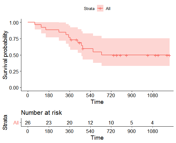 我们以数据 包中的dataset3survival为例。事件发生的时间就是死亡的时间。Kaplan-Meier图如下。