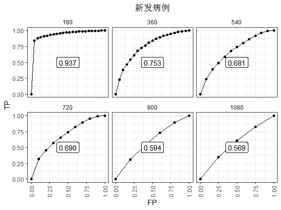 总之,我们研究了时间依赖的ROC及其R实现。累积病例ROC可能与风险 (累积发生率)预测模型的概念更兼容 。新发病例ROC可用于检查时间零标记在预测后续事件时的相关性。