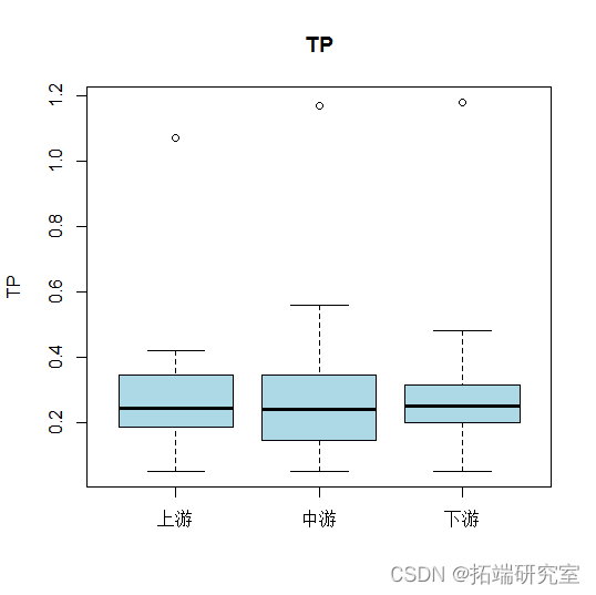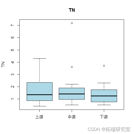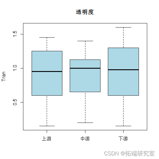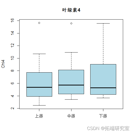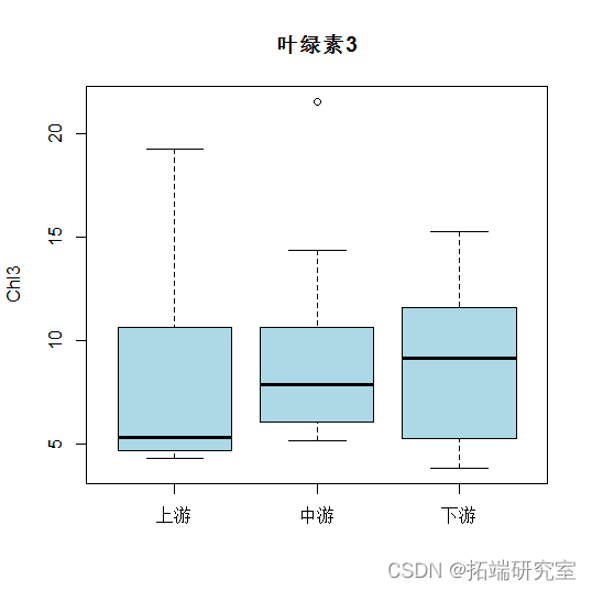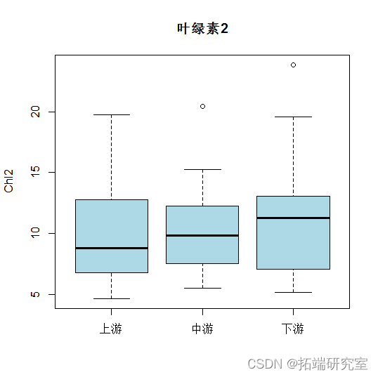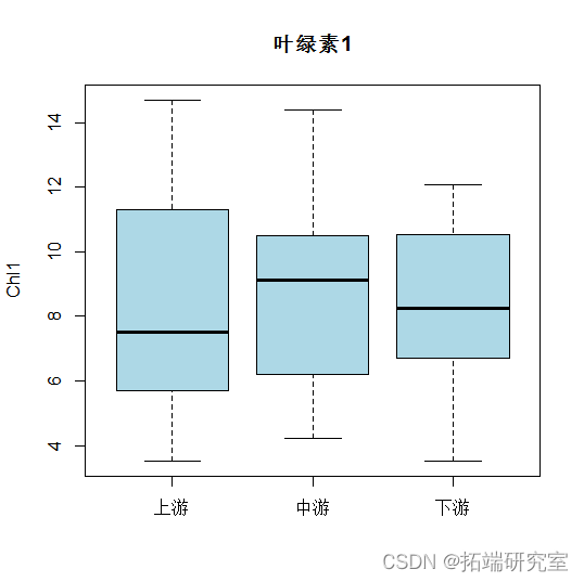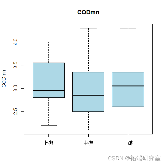 - CODmn和中间部分的叶绿素是下游部分最高。但总体来说,各指标的均值差距都不大。