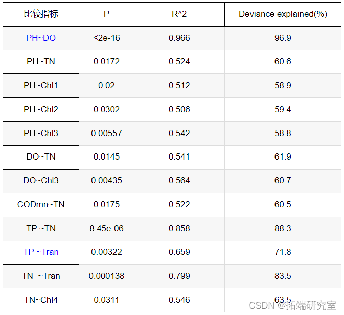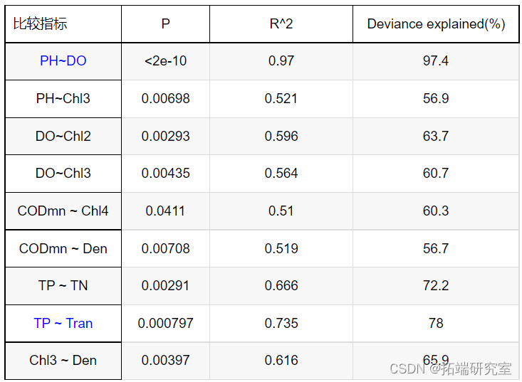 (1)PH和DO密切相关,P值远小于0.0001,相关系数均大于0.95,偏差解释度都在96%以上。由于光合作用消耗二氧化碳产生氧气,使DO和PH值均升高,二者成正相关。