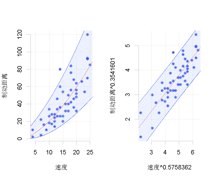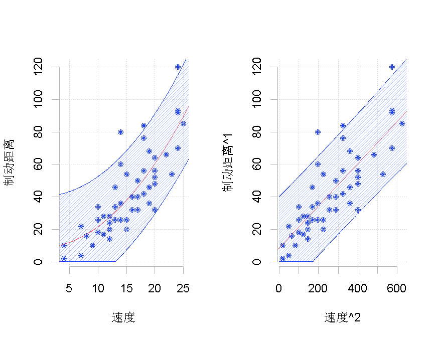 其中有两种可能的转换。在这里,我们只考虑了汽车速度的平方(这里只变换了一个分量)。在该转换后的数据集上,我们运行标准线性回归。我们在这里添加一个置信度。然后,我们考虑预测的逆变换。这条线画在左边。问题在于它不应该被认为是我们的最佳预测,因为它显然存在偏差。请注意,在这里,有可能考虑另一种形状相同但完全不同的变换