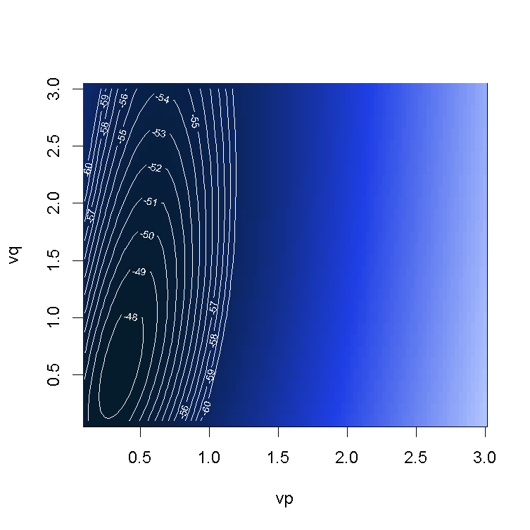 颜色越深越好(这里考虑的是对数似然)。 最佳对数在这里是