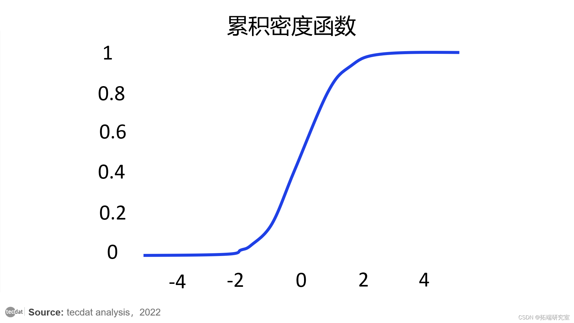具有零平均数和单位方差的正态分布的CDF。它显示,几乎所有的点都大于-4,小于4,其中50%的点小于0