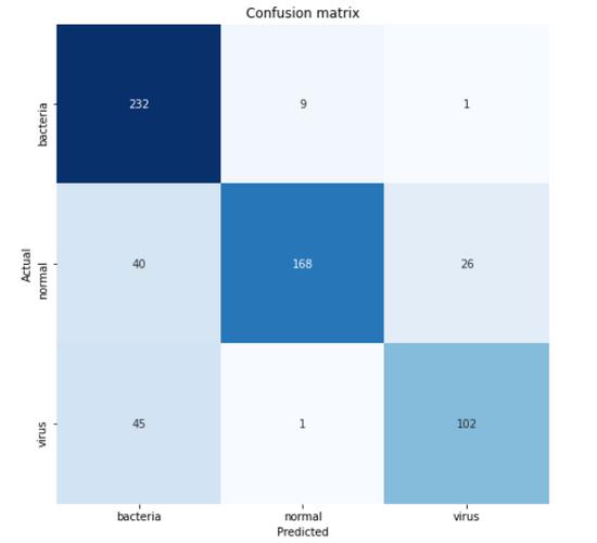根据上面的混淆矩阵,我们可以看到45张病毒X射线图像被预测为细菌。这可能是因为很难区分这两种肺炎。但是,至少因为我们对242个样本中的232个进行了正确分类,所以我们的模型至少能够很好地预测由细菌引起的肺炎。