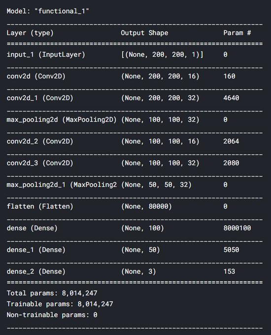 input1 = Input(shape=(X_train.shape[1], X_train.shape[2], 1)) cnn = Conv2D(16, (3, 3), activation='relu', strides=(1, 1), padding='same')(input1) cnn = Conv2D(32, (3, 3), activation='relu', strides=(1, 1), padding='same')(cnn) cnn = MaxPool2D((2, 2))(cnn) cnn = Conv2D(16, (2, 2), activation='relu', strides=(1, 1), padding='same')(cnn) cnn = Conv2D(32, (2, 2), activation='relu', strides=(1, 1), padding='same')(cnn) cnn = MaxPool2D((2, 2))(cnn) cnn = Flatten()(cnn)cnn = Dense(100, activation='relu')(cnn) cnn = Dense(50, activation='relu')(cnn) output1 = Dense(3, activation='softmax')(cnn) model = Model(inputs=input1, outputs=output1)