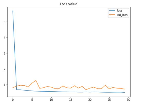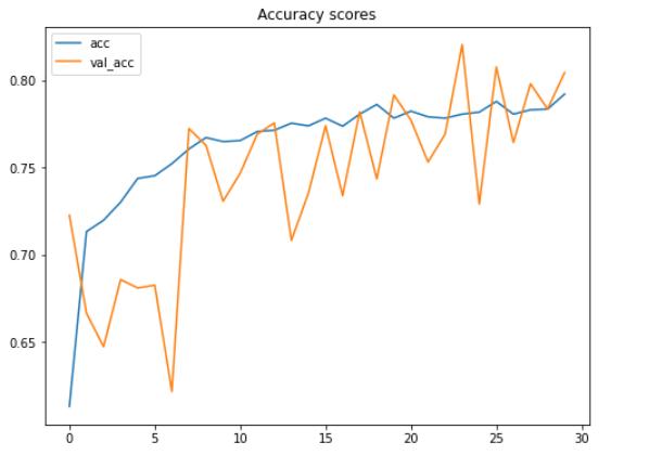 Epoch 1/30 163/163 [==============================] - 19s 114ms/step - loss: 5.7014 - acc: 0.6133 - val_loss: 0.7971 - val_acc: 0.7228 . . . Epoch 10/30 163/163 [==============================] - 18s 111ms/step - loss: 0.5575 - acc: 0.7650 - val_loss: 0.8788 - val_acc: 0.7308 . . . Epoch 20/30 163/163 [==============================] - 17s 102ms/step - loss: 0.5267 - acc: 0.7784 - val_loss: 0.6668 - val_acc: 0.7917 . . . Epoch 30/30 163/163 [==============================] - 17s 104ms/step - loss: 0.4915 - acc: 0.7922 - val_loss: 0.7079 - val_acc: 0.8045