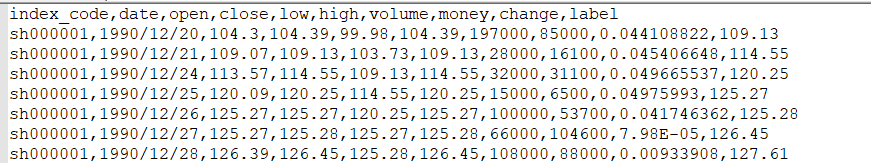 如上,可以看到用例包含:index_code,date,open,close,low,high,volume,money,change这样几个特征。提取特征从open-change个特征,作为神经网络的输入,输出即为label。整个代码如下: