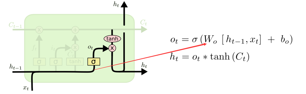 通过sigmoid确定细胞状态那个部分将输出,tanh处理细胞状态得到一个-1到1之间的值,再将它和sigmoid门的输出相乘,输出程序确定输出的部分。